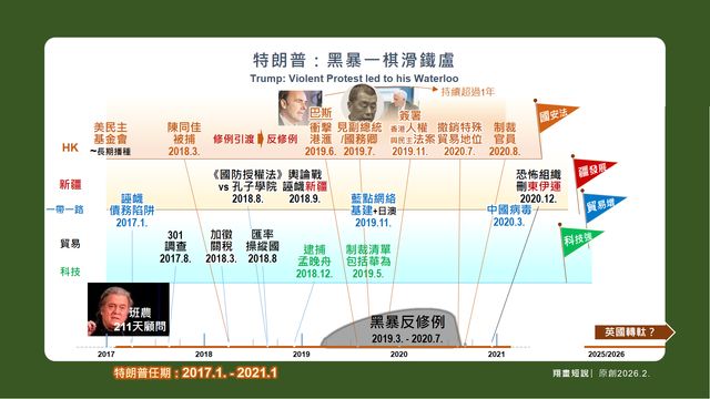 2020年6月《香港國安法》實施後,香港暴力事件迅速清零,社會秩序與經濟活力逐步回暖。特朗普與班農等極度反華顧問,未能客觀認識形勢,「不知己、不知彼」,憑謊言制定政策,豈有成功之理?西方盟友同樣不顧事實,無理指責,最終自食其果。同流合污如班農之流,早已淪為特朗普「不用即棄」的棋子。