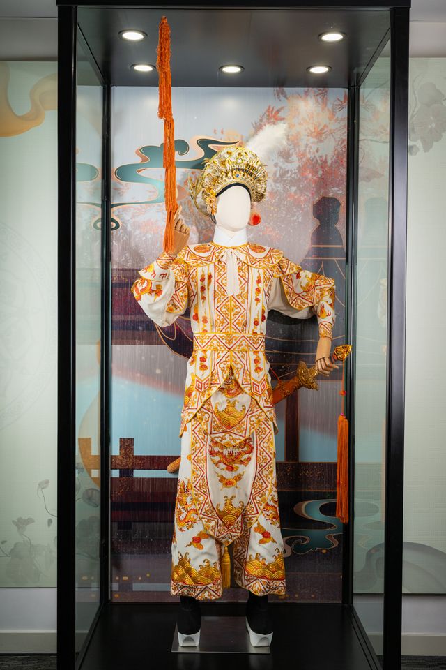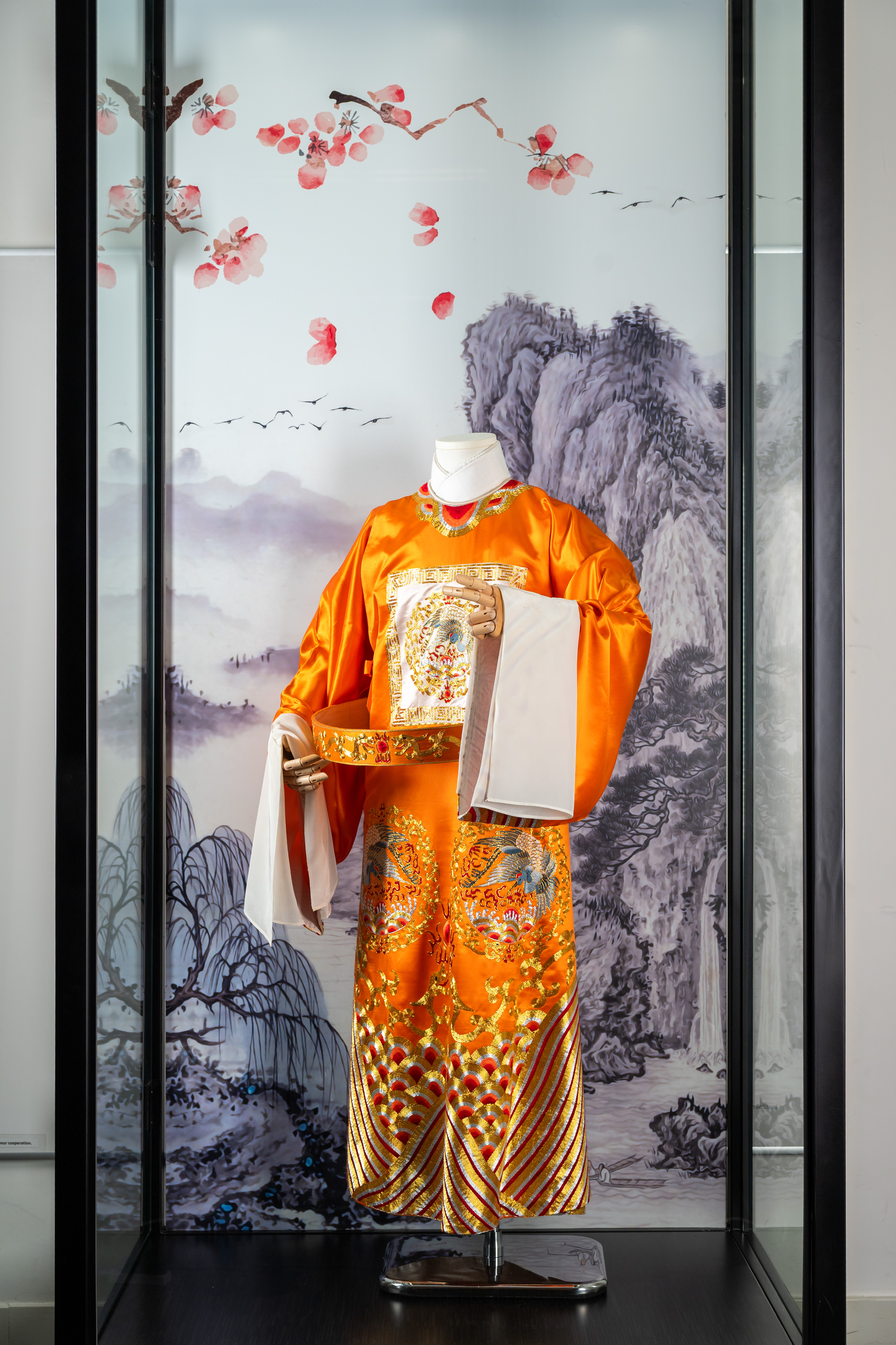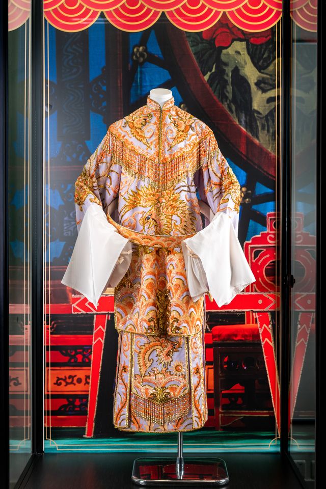 另一焦點展品是林家聲博士於1987年演出《煙雨重溫驛館情》時的橙底金線仙鶴補子花圓領戲服,全衣以傳統「釘金繡」工藝一針一線縫製,華貴奪目。這類「花圓領」又稱「改良官衣」,專為官階較高的文武官角色而設,其下擺繡有圖案,有別於一般素色官服。