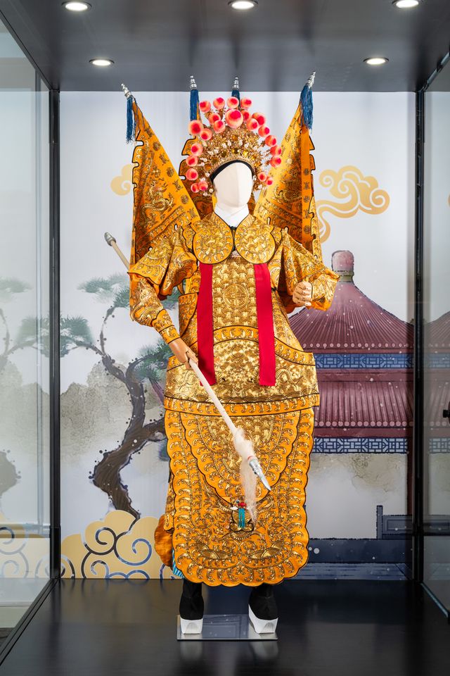 此外,龍貫天先生借出的橙色顧繡「大靠」,是傳統戲中武將如將軍、元帥所用的戰袍。他曾穿着這套戲服演出過《隋宮十載菱花夢》等多個劇目。這套氣勢磅礴的戲服結構繁複,其背部插有四支靠旗,相配合的大額子亦會一併展出。