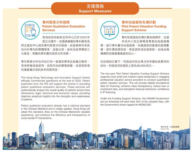 為推動知識產權的產業化進程,特區政府近年積極推出針對性支援措施。2025年《施政報告》公布多項強力舉措,包括啟動知識產權融資沙盒以協助試點行業進行融資,提供專利質素分析服務,以及推出為期兩年的專利估值資助先導計劃等。相關政策正逐步落實,銳意打造香港成為區域知識產權貿易中心。
