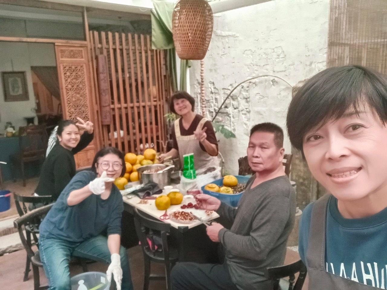 朋友帶我去的一處老宅庭院,長桌上擺滿了曬乾的茶葉與切開挖空的虎頭柑,那是一種用雙手捧住才能拿得穩的大柑橘,只有過年才買得到。幾位長輩一邊閒話家常,一邊示範怎樣把茶葉一撮一撮塞進柑裏。除了烏龍茶與紅茶葉,內餡更加了果肉、金銀花、魚腥草、紅棗、枸杞子等。塞滿之後要拿去蒸,蒸完再拿出來曬,這樣重複多次,得耗上半年。