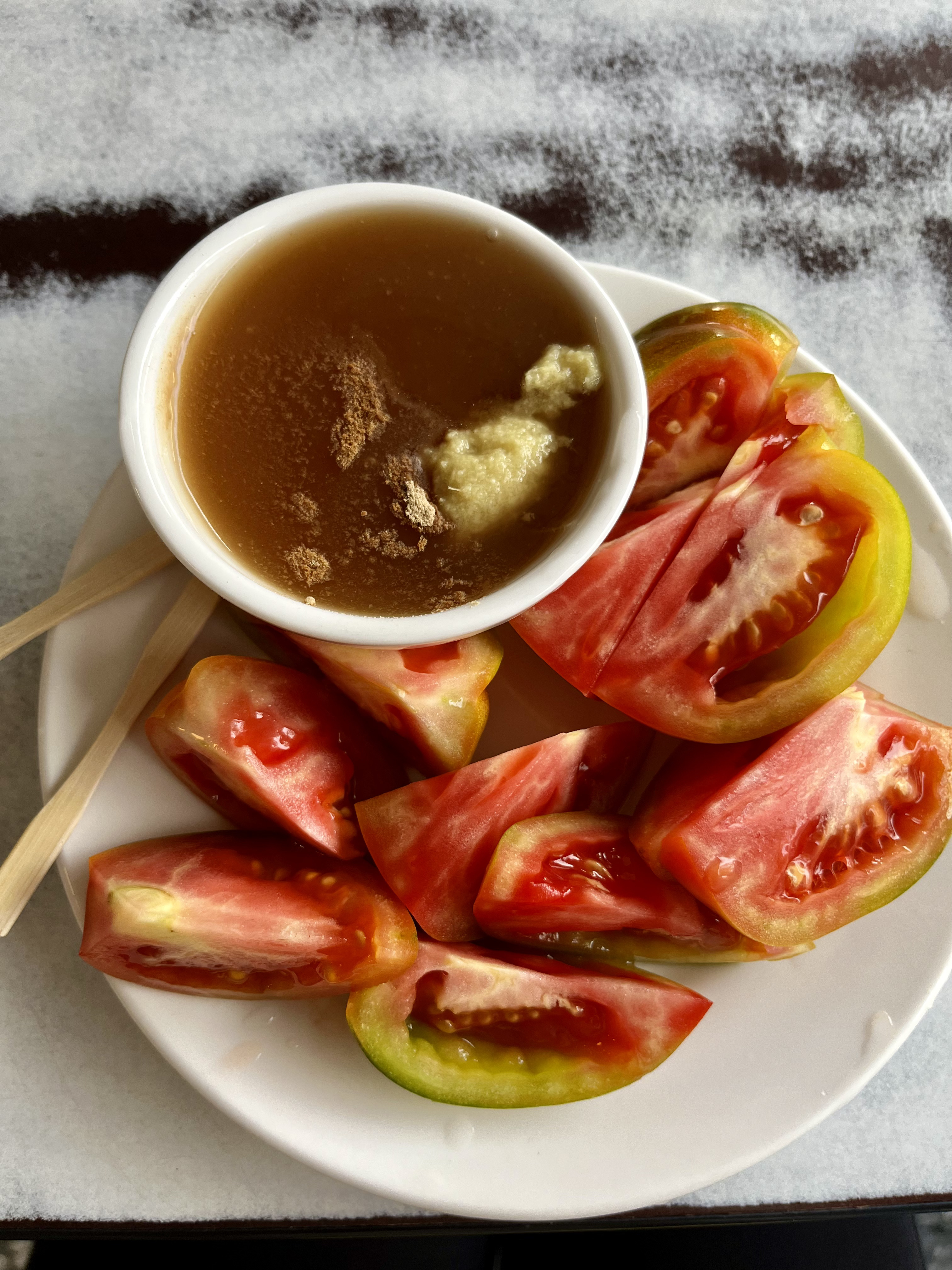 眾多小吃裏,最讓我難忘的是台南人津津樂道的「古早味番茄切盤」。一整顆番茄切成厚實的瓣狀排在白瓷盤裏。旁邊是一碟看似普通,實則暗藏玄機的沾醬──醬油膏裏拌着砂糖,再堆上一小座細細剁碎的薑蓉。初看覺得怪異,入口卻是驚喜。醬油的鹹鮮裏滾着砂糖未全融化的顆粒感,薑的辛辣在舌尖竄動,番茄本身的酸與果香把這一切兜在一起。甜、鹹、辣、酸同時在口腔裏綻開,清爽又過癮。