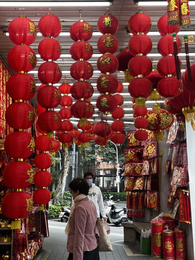 平日裏,大稻埕迪化街是南北貨的集散地。一到農曆年前,舖子門口掛上紅布條,搖身一變成為年貨大街。叫賣聲、試吃的吆喝聲、人群的談笑聲交織在一起。紅燈籠從屋簷下一串串垂落,小孩們圍在糖果攤前,伸長了手指比劃;乾貨店裏,魷魚絲、肉乾、蝦米、香菇的鹹香味,與外頭花生糖、牛軋糖、五色軟糖的甜膩撞在一起,混成一股只會在過年才有的氣息。除了傳統攤檔,也有文創小店,把新的手作擺進舊街屋裏。