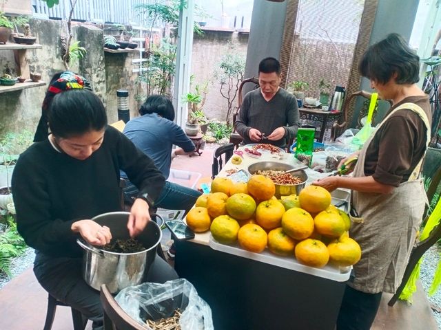那天,大家你一言、我一語地教我怎麼塞茶、怎麼轉動果皮,怕我用力太重把果殼捏破,又怕我下手太輕塞得不夠實在。讓我記住的,倒不是每一道工序,而是那種「把陌生人也算自己人」的自然。