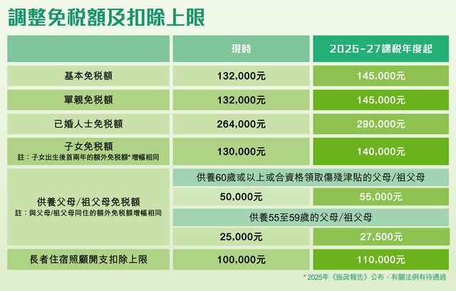 基本免稅額及單親免稅額由13.2萬元增加至14.5萬元,已婚人士免稅額由26.4萬元增加至29萬元;子女免稅額及額外子女免稅額由13萬元增加至14萬元。另外,增加供養父母或祖父母的免稅額及長者住宿照顧開支扣除上限。詳情見表: