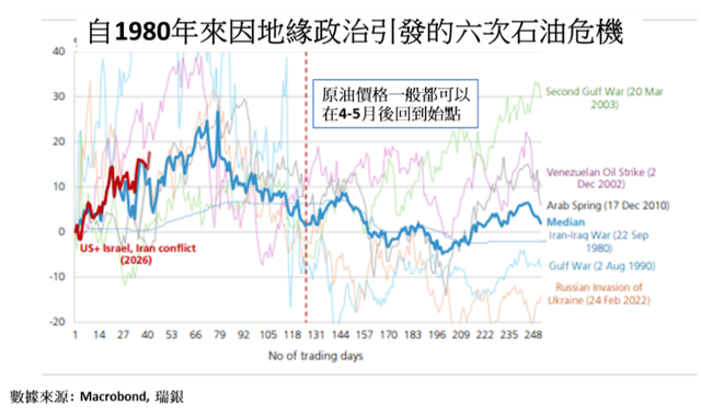 下圖搜集了自1980年以來,六次因地緣政治衝突所引發的石油危機中,原油價格的表現。如果以這六次事件的中位數(藍色線)為指標,不難發現,事件的影響一般都可以在四至五個月減退,原油價格就可以回到事發前的水平。