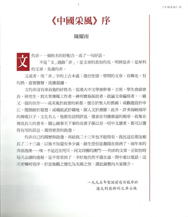 1996年我把在《信報》及《信報月刊》發表的相關文章輯成《中國采風》一書,邀請已經移民澳洲的陳老師賜序,他很爽快答應,更解開了我的名字之謎:「文灼非,一個姓名的好配合,成了一句好話。不是『文』過飾『非』;是文章的真知灼見,明辨是非;是犀利的文章,灸過灼非。又或者,用「非」字的上古本義:發自性情、學問的文章,有輝光、有灼熱,蜚實騰聲,流傳遐邇。文灼非沒有辜負他的好名字⋯⋯」
