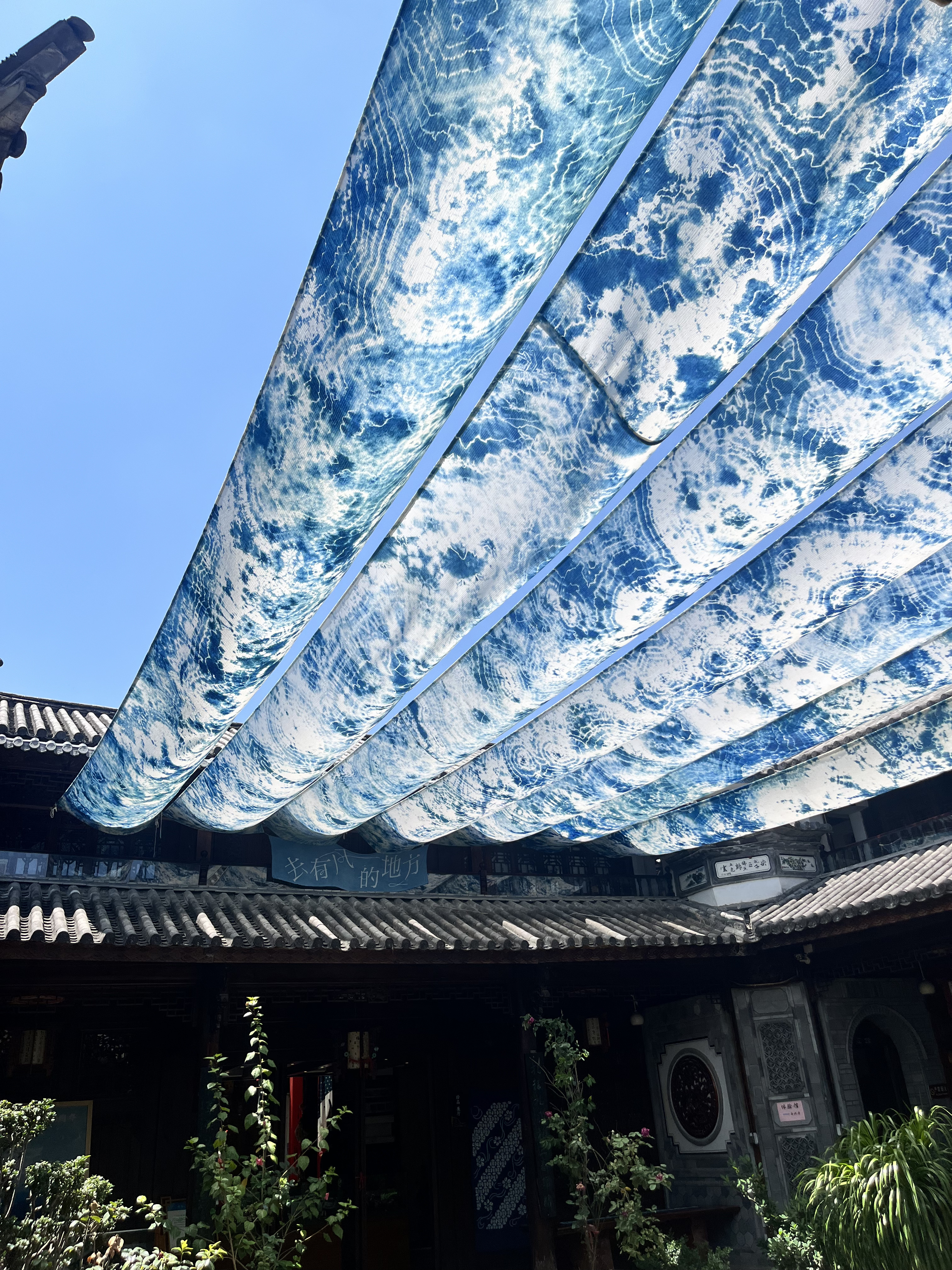 喜洲古鎮是白族紮染的故鄉,這門工藝源於附近的周城村。以板藍根提煉的靛藍染料,在白布上勾勒花紋,再經縫紮、浸染、晾曬,最後在陽光下展現藍與白的流動之美。走進古鎮,藍白相間的紮染布在街巷上空輕輕晃動,像洱海的藍、又像山腰的雲,我始終偏愛這種帶着天空氣息的顏色。