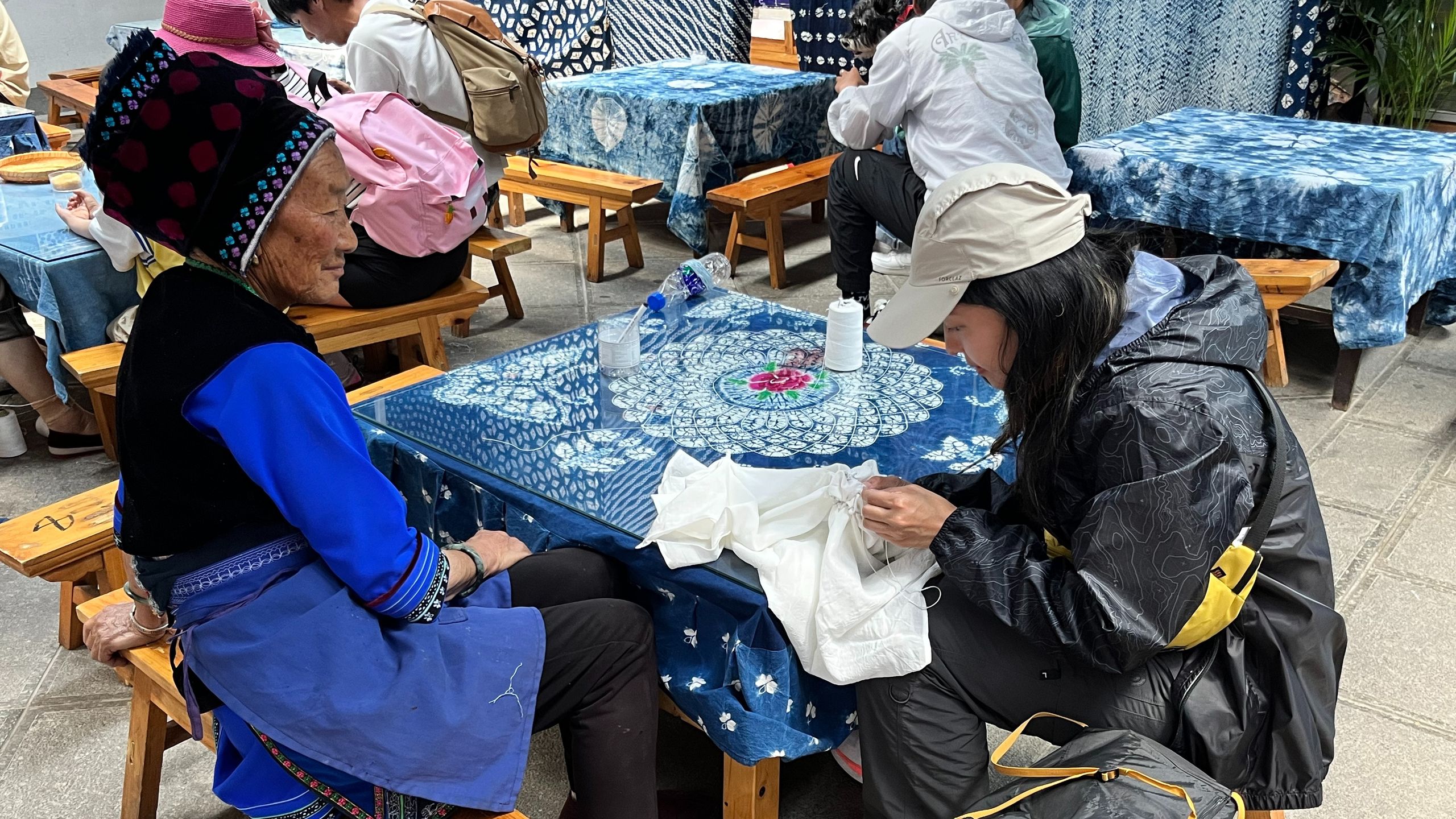 在璞真白族紮染博物館,我跟著白族大娘親手體驗紮染。選好圖案後,用粗針粗線將白布一點點縫紮成疙瘩,束緊後浸入藍色染缸。片刻後撈起,掛在院子裏晾曬。風拂過,染布獵獵作響。等全乾後拆線漂洗,藍白的紋路像一朵浪花,在布上緩緩綻開。