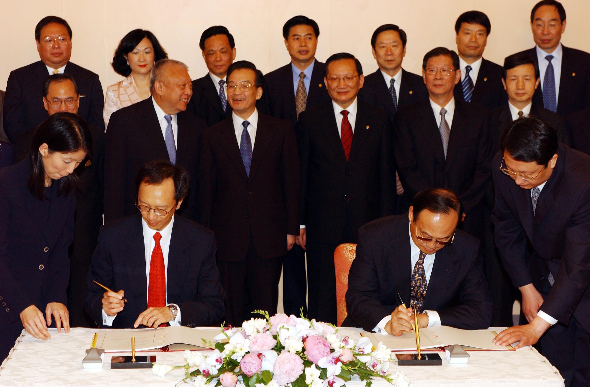 ![Premier Wen Jiabao and Chief Executive Tung Chee Hwa witness the signing of the Mainland and Hong Kong Closer Economic Partnership Arrangement (CEPA) today (June 29).