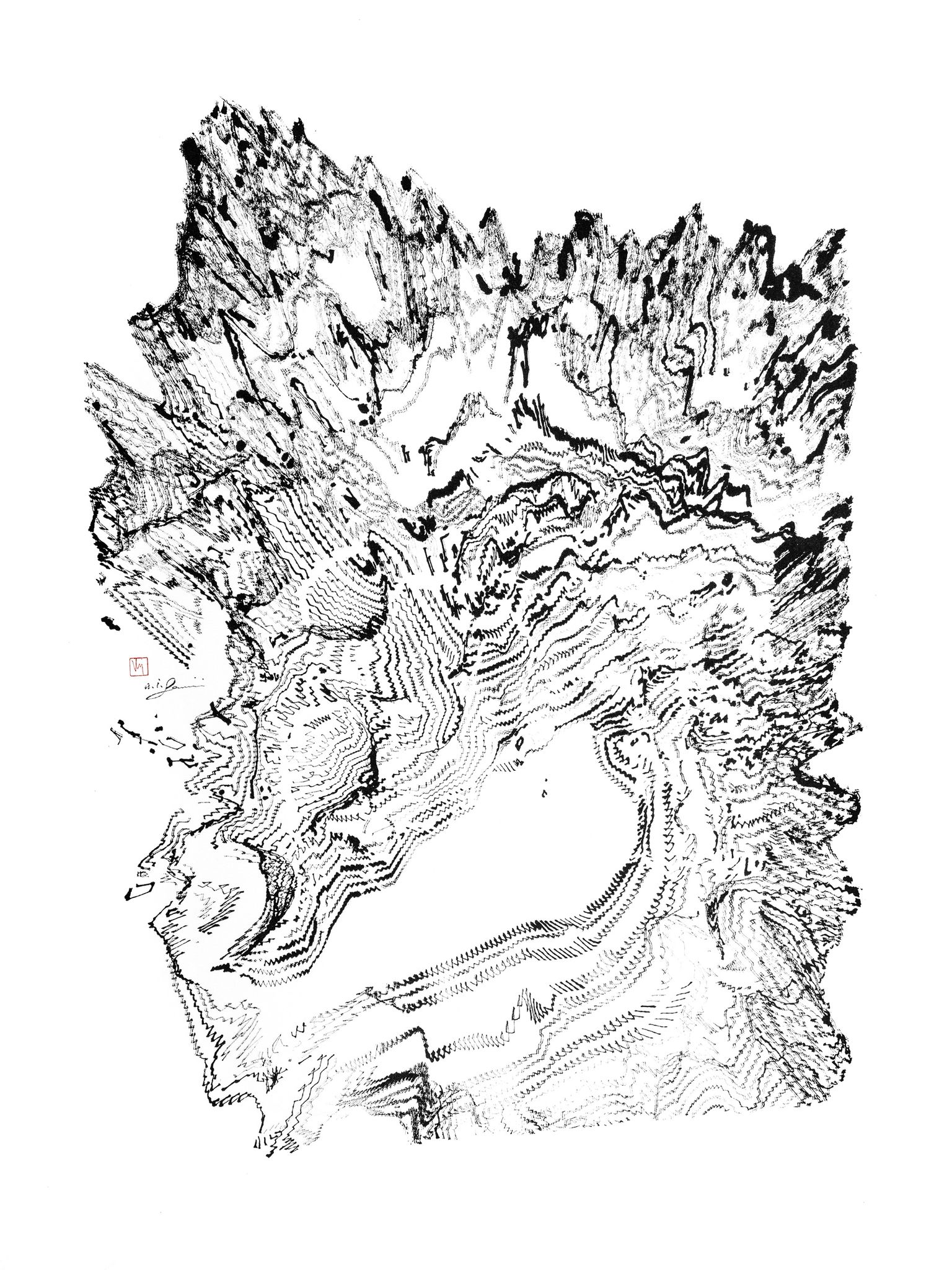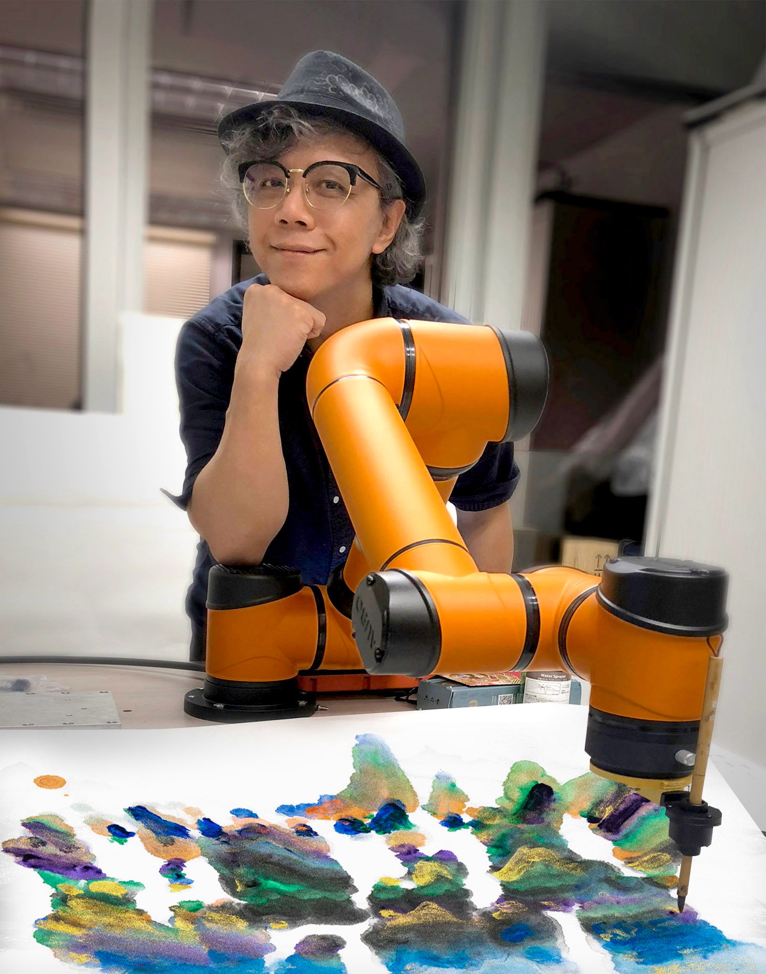 2018年他發明了史上首位人工智能水墨藝術家,耗時三年,投資300萬,開創機械手臂繪水墨山水的先河。他解釋:開始用AI分析實時天氣或股票市場,將數據組織成山巒起伏的3D地理,然後操控機械臂使用毛筆、水墨、Acrylic在宣紙上「寫生」,利用AI重現心中的風景。