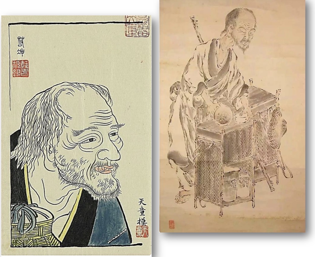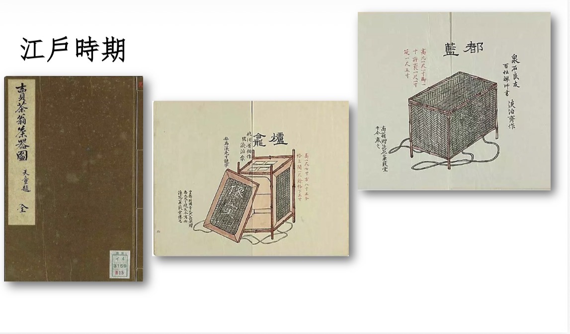 《賣茶翁茶器圖》(1823年),乃木村孔陽氏模寫賣茶翁之茶具,共33件,刻來甚為精細。例如「爐龕」乃放置爐子的小閣子;「都籃」則是飲茶完畢,用作收貯所有茶具之用;「銅爐」用作生火煮茶,以鍛鐵鑄之,或燒製泥爐代用;「急燒」又稱急須,煮茶、暖酒器名;「茶罐」即存放茶葉的罐子,以錫製成;「吹管」是起爐火時用的吹火管子,為街邊賣茶必要茶道具;「檐子」類似扁擔,乃挑貨擔子;「錢筒」則為存放錢幣的竹筒。