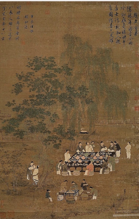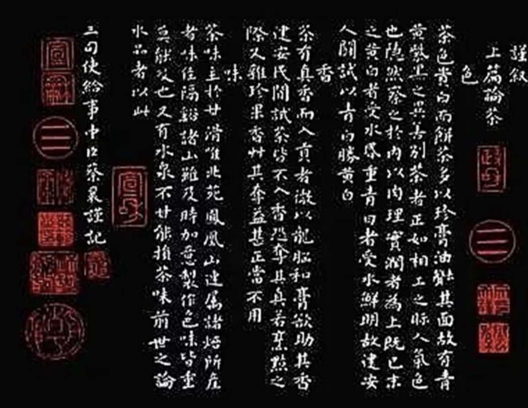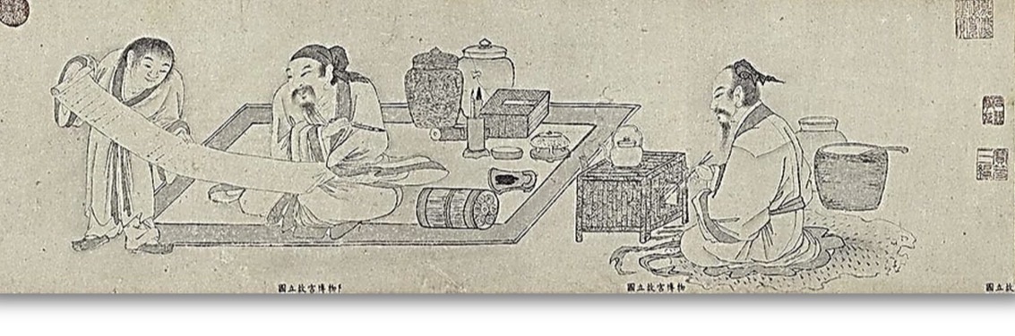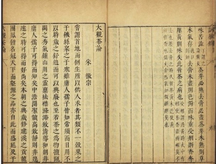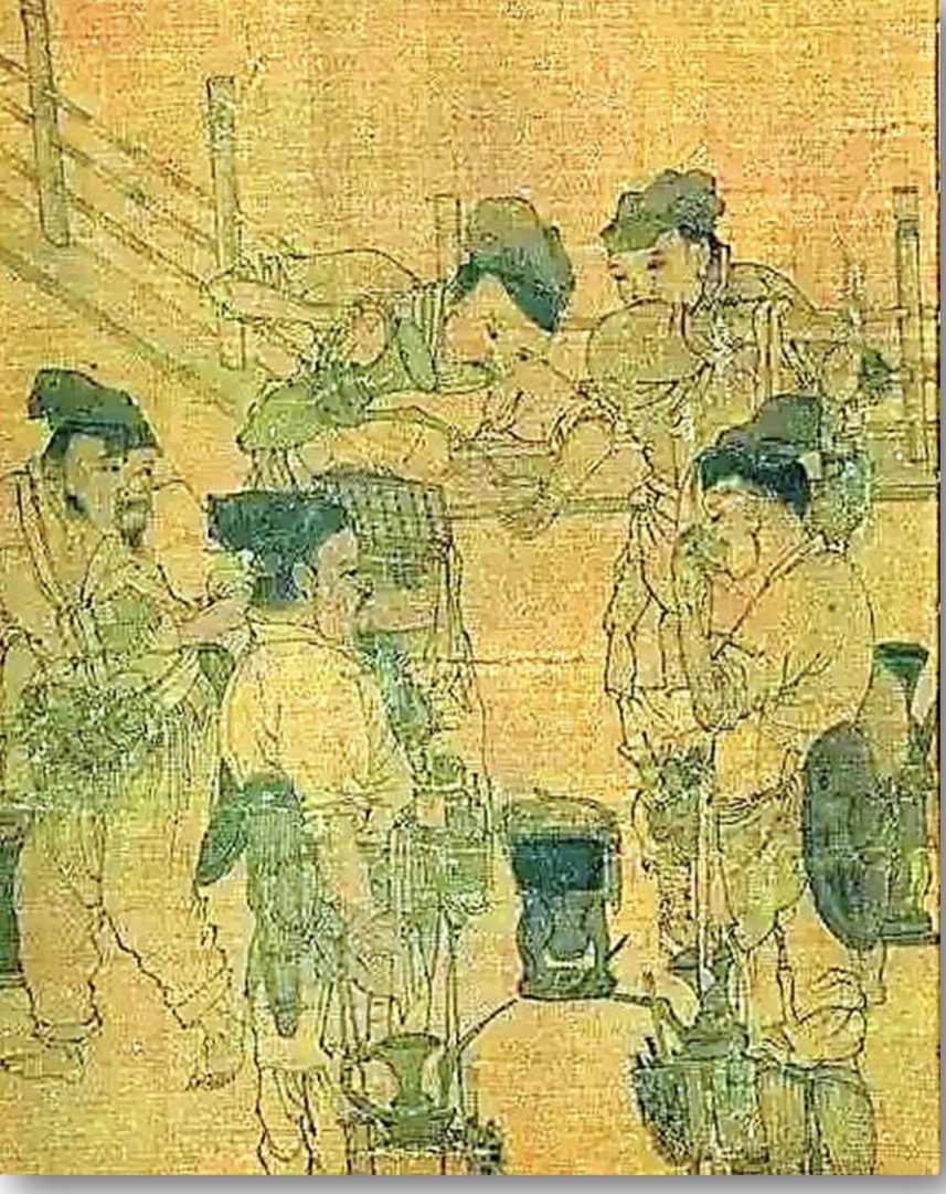 宋徽宗《文會圖》,描繪幾個人在泡茶,桌上放置茶盞……如實反映當時的生活。他甚至派出蔡襄往福建負責生產茶,宋審安老人《茶具圖賛》是著名的書法家,其《茶錄》一書,上篇論及茶之色、香、味……