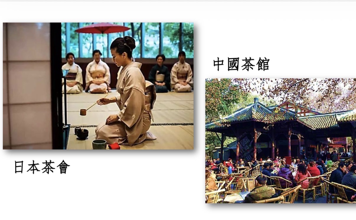 他先以兩幅照片,點出「日本茶會」和「中國茶館」之別。日本喫茶的敍會稱為「茶會」,在漂亮的茶室,穿上和服的女士,正在進行茶藝活動,她們正襟危坐、神情肅穆……而中國成都的茶館則大異其趣,大家圍坐一起,擺龍門陣,開心地喝茶、聊天、吃瓜子、看報紙,呈現出生活化的場景。