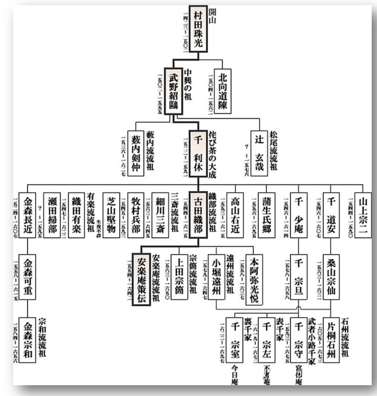 1591年,利休在秀吉的強迫下自殺,但是利休的精神,被其弟子及其子孫代代相傳而得以延續。千利休的後人,各自建立茶室,分為「表千家」、「裏千家」、「武者小路千家」三流派,通稱為「三千家」。
