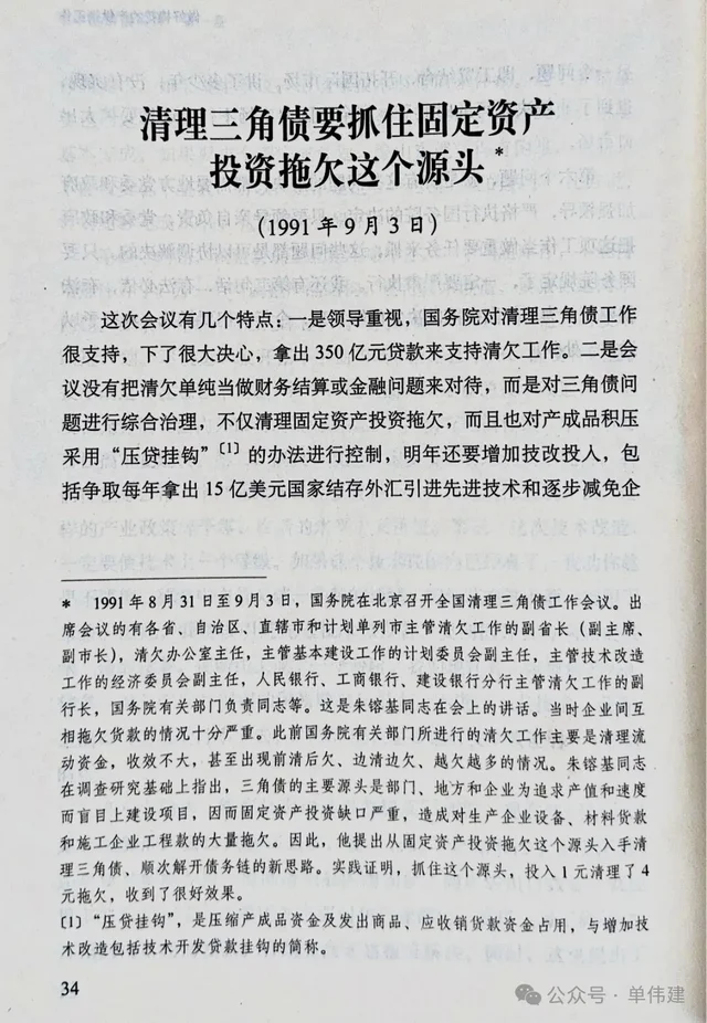 舉幾個例子。1991年,朱鎔基到北京任國務院副總理,第一個挑戰就是清理三角債。當時全國的三角債規模達到了3000億,而前一年全國的GDP也才1.8萬億。朱做了大量調研,發現一大根源是地方政府搞了很多基礎設施項目,但沒有充分的配套資金,施工方拿不到錢,於是不付給上游,上游就不付給更上游,三角債就這樣堆積起來了。朱鎔基就從源頭入手,重點清理固定資產投資項目拖欠這個源頭。