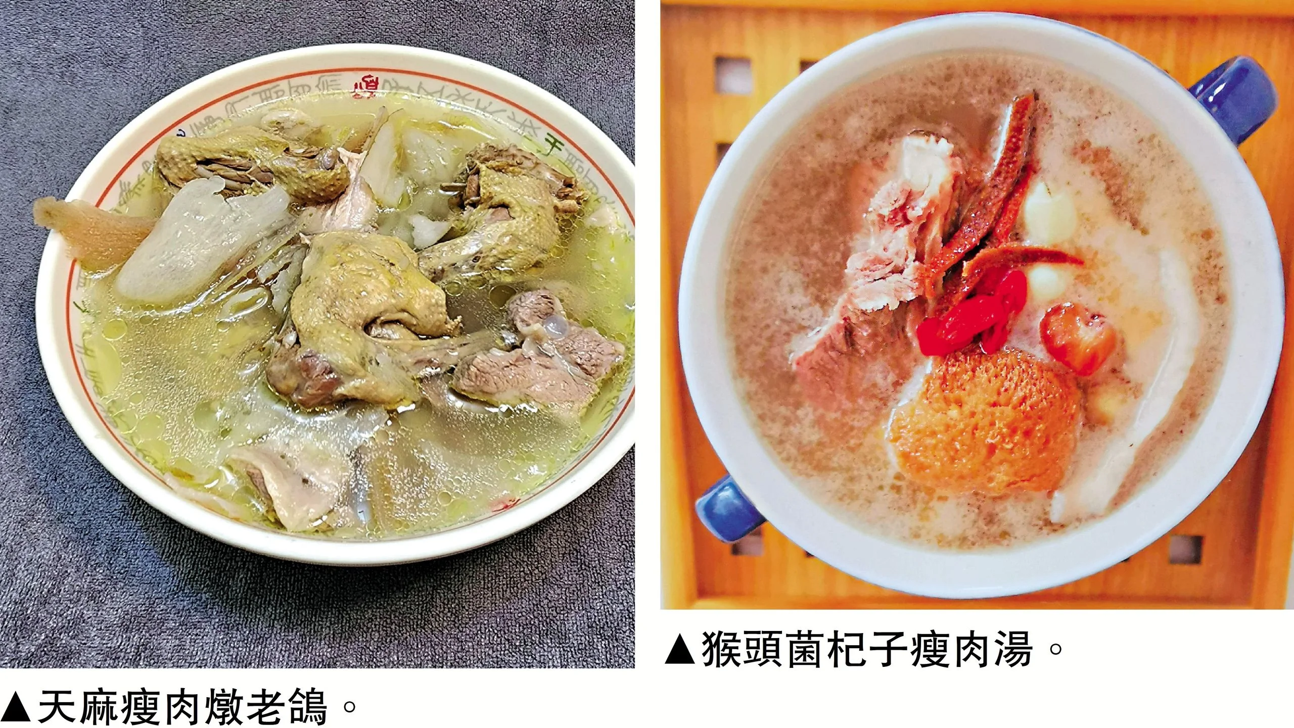 天麻瘦肉燉老鴿,是源於四川的傳統安神湯品,本名是「天麻鴿脯」,以吃乳鴿脯及飲湯為主。這道湯可作為燉湯,也可用煲老火湯的方法。以下食譜筆者改用老鴿,用大家熟悉的廣東燉湯方法製作。其傳統功效是清腦寧神、治療頭暈頭痛,可改善睡眠,但患感冒者則不宜。買不到老鴿,可用普通乳鴿代替。將一隻老鴿斬去頭爪,再斬成四件洗淨,出水1分鐘撈起,放入150克瘦肉切四塊,出水半分鐘撈起。4片天麻用水沖洗一下,加入老鴿、瘦肉、20克淮山,4片薑及滾水或清湯,再加1湯匙紹酒,封蓋燉一個半小時,加鹽調味即成。