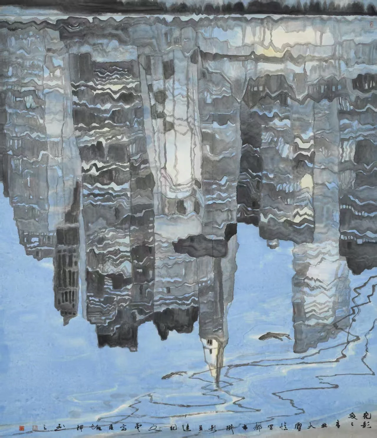 望向展廳的《光影匆匆》的水墨倒影,便是方廣智的大作:好一幅奇妙的水中倒影,寫出美麗廈門臨海的地域特色。濃淡墨色間滲透淡花青的層次,不規則的波段於倒影中晃動。忽然腦海閃出:「若接若離,道之為物,唯恍唯惚。惚兮恍兮,其中有象;恍兮惚兮,其中有物;窈兮冥兮,其中有精,其精甚真,其中有信」。不可捉摸的倒影,深邃奥秘之中顯現具象,倒影之上聳立核心價值的建築實體,筆墨始終沒有流失城市的真貌。