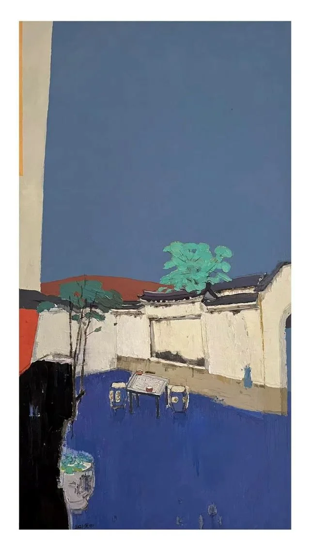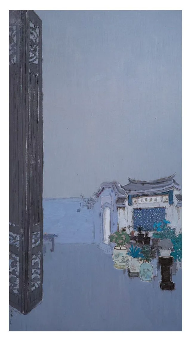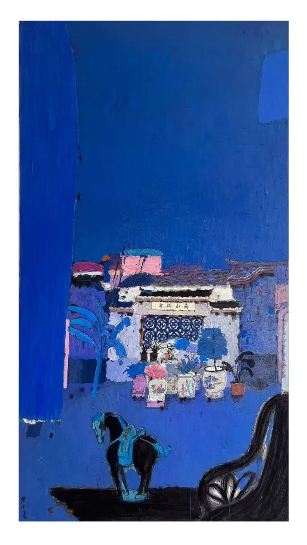 當眼即被黃偉的油畫──《南山毓秀》、《蘭芳桂馥》、《翠碧風輕》吸弔。純視覺的畫面,藍色空間的鋪陳,中國式油畫的東方美,展示了福建古民居院落,質樸雅緻的風情,言簡意賅的故事,輕訴出閔南人歲月靜好,唯美如詩的古韻新境。令人在雙目游移中,頃刻尋夢故鄉,產生心智的雀躍。
