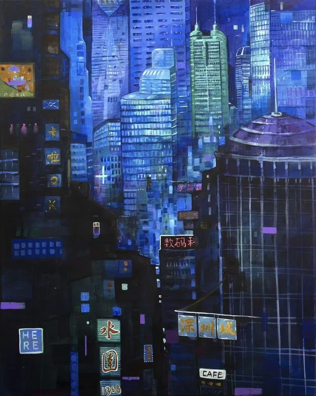 請欣賞她參展作品之一《靛藍色的深圳》。這不是攝影機下的鏡頭,而是畫筆下虛實相應的塊面漸變。典型的大廈地標及高樓下的招牌,襯托出改革開放後,捷速發展的深圳,集財金、科技、休閒、美食、市井煙火,活色生香的真實寫照。