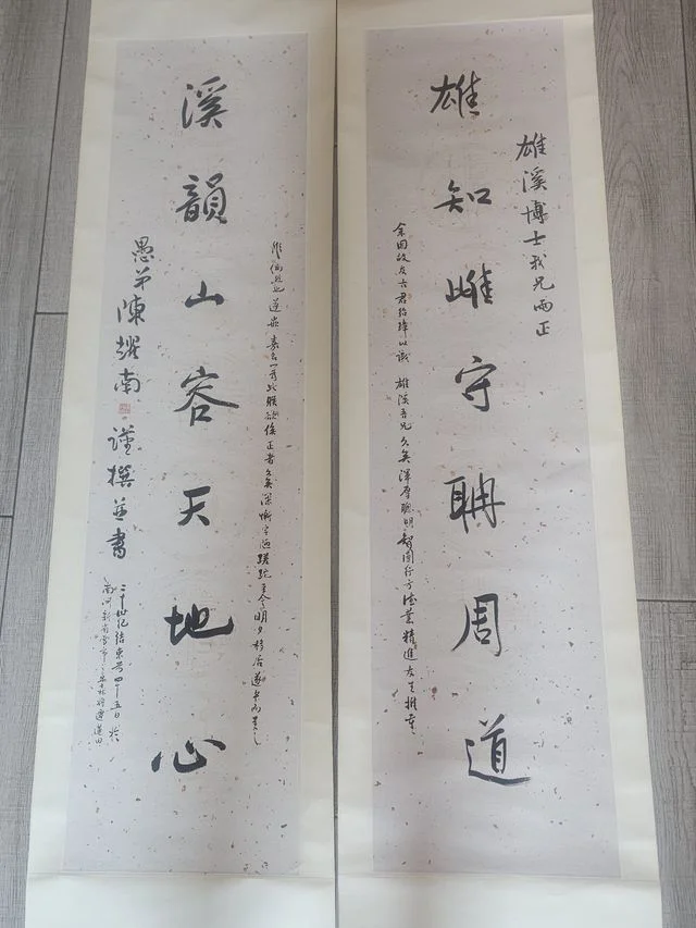 聯旁有小字書曰:「余因故友古君紹璋以識 雄溪吾兄久矣渾厚聰明智圓行方德業精進友生推重非偶然也遂嵌嘉名以為此聯欲俟正者久矣深慚字陋蹉跎至今明夕移居遂書而呈之」