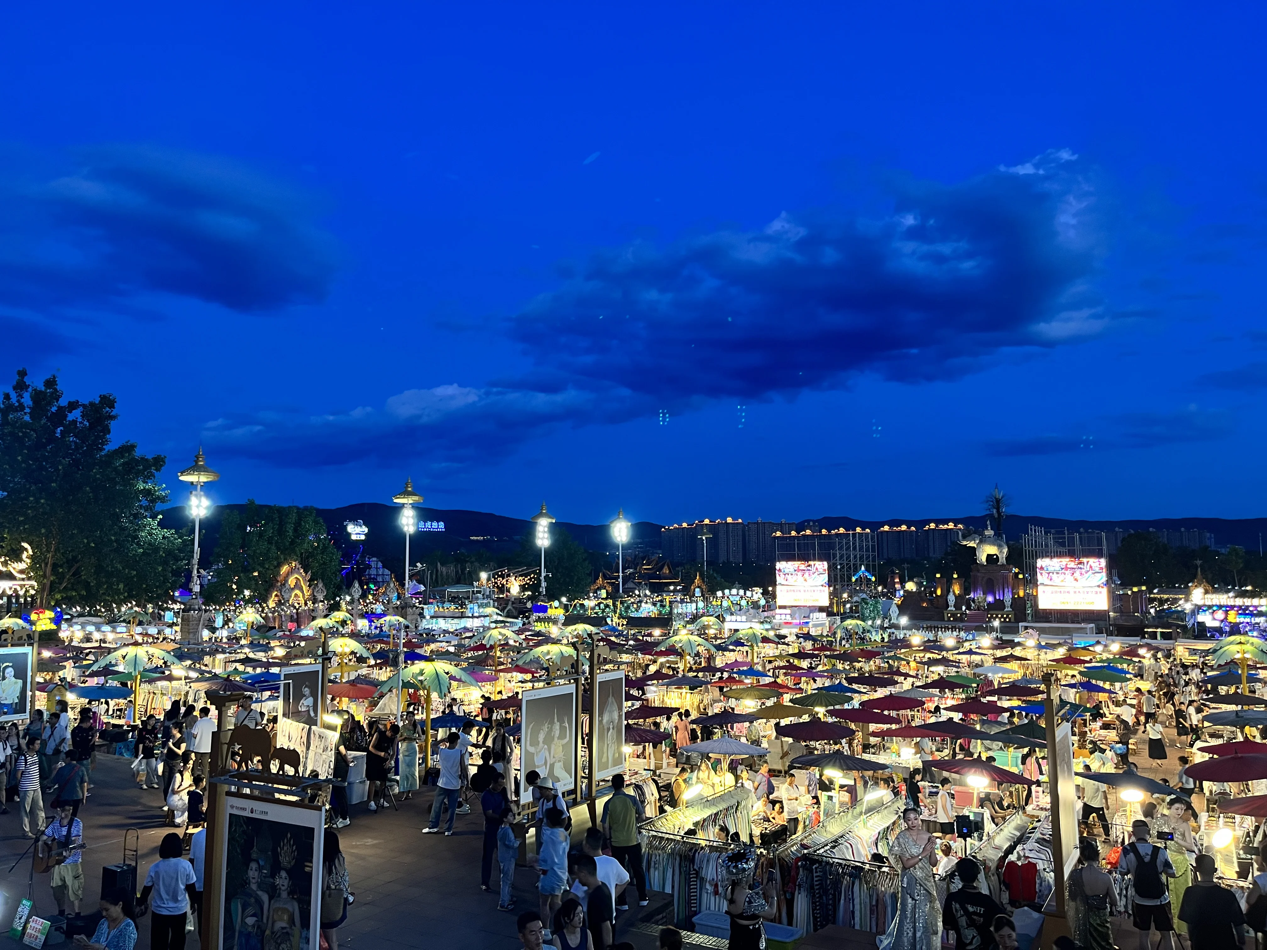 我站在高處,看着星光夜市在腳下慢慢亮起來。夕陽把天邊染成紫紅色,瀾滄江邊的風帶着潮濕的溫度擦過皮膚。夜市的燈同時被打開,好像有人把一盒霓虹顏料灑在河岸:金色大塔的塔尖被打亮,東南亞風格的屋頂被描出輪廓線,街道兩旁密密麻麻的攤位排成一條又一條光帶。