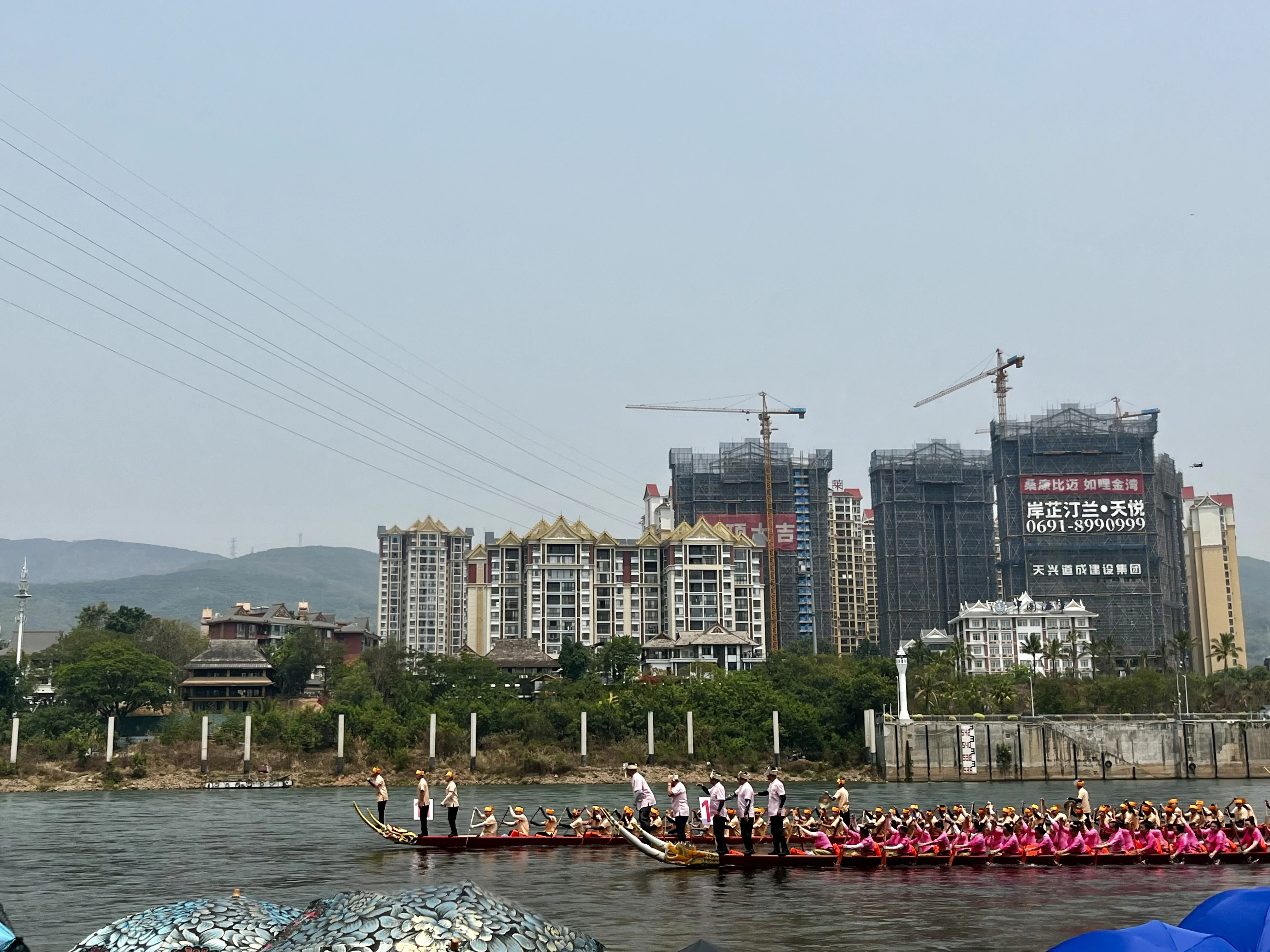 節日前兩天,村人聚在瀾滄江上賽龍舟。一條條長船貼着水面飛馳,鑼鼓聲一陣緊過一陣,沿岸的人扯開嗓子歡呼。另一頭,岸邊的村民在放高升,色彩繽紛的土火箭燃起來,像一束束彩雲衝上藍天。吶喊聲、鼓聲、人聲,混着煙火味和空氣中的潮濕鹹味,五官同時被四面八方的氣息包圍。版納有一種理直氣壯的熱烈,讓你沒辦法把自己抽離出去。