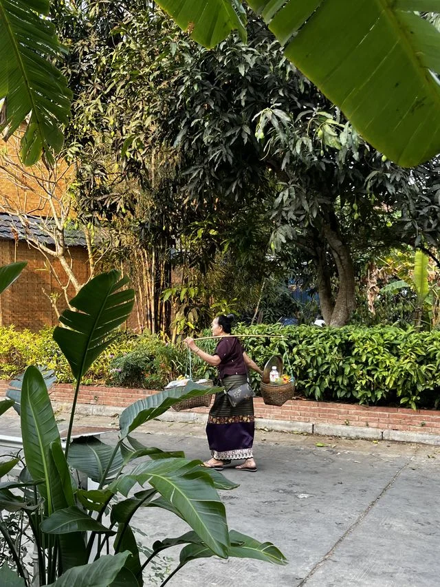 起初,我只是站在高處靜靜觀察:底下的人流湧動,女孩子穿着民族服裝在拱門下擺姿勢拍照,街頭歌手在轉角輕聲唱歌,遊客手上拿着各種食物——泰式燒烤、老撾咖啡、越南小吃……