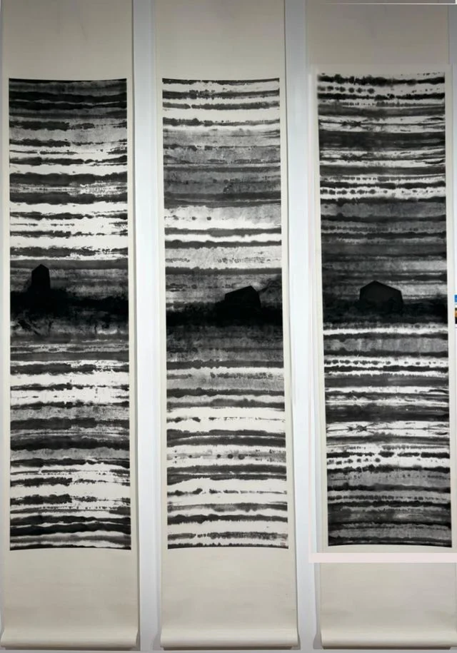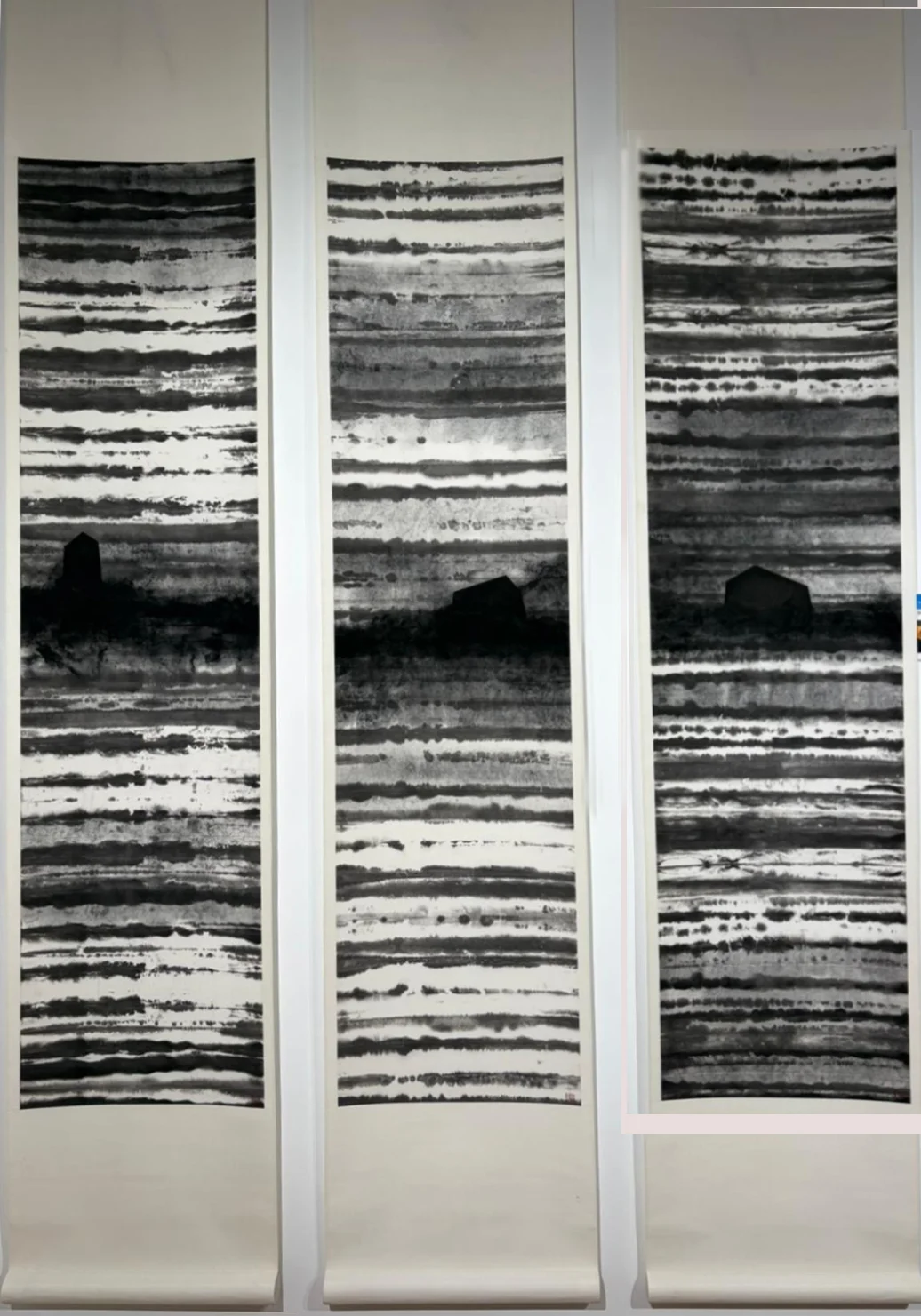 欣賞他的參展大作《波光》,橫向不規則的墨跡筆觸,節奏層次變幻有序,點線面掌控自如,濃淡暈染的水漬墨痕,醉墨滴淌出的時空特寫,消解了傳統水墨的陳規,橫條中偶爾的段落留白,平衡的空間呼吸沁人肺腑。詩意盎然水色粼粼,天高海闊浪花茫茫,圓月投射跌宕懸浮。屏幅中迷惘的黑影,裹挾着斷續的海岸孤島,海面雖未見曦色,但《波光》盪漾魅力四射。極簡的當代水墨實踐,抽象而豐滿三聯屏,構建出層層情感的遞進,仿佛也是張益昇的精神歸宿,填滿着他漂泊游離的親歷,水中可觸摸他的情緒質感。滔滔的《波光》決非冷漠,閃爍着兩岸三地文脈的溫度。水墨中隱約聆聽他既愛台灣亦鍾情祖國,情牽兩地的連綿絮語。