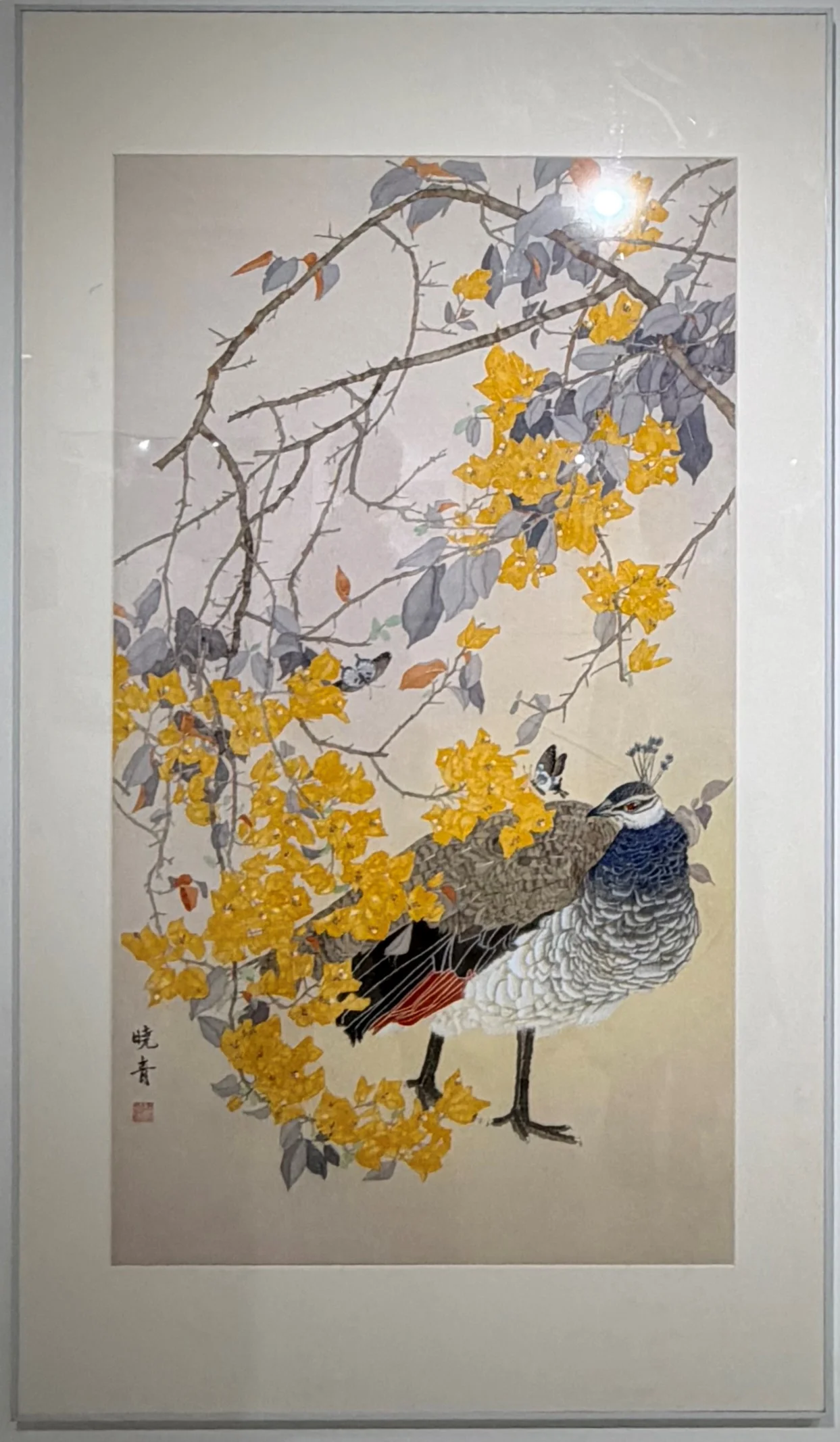 參展的另一位本港青年藝術家徐曉青,作品《黃玉叠翠羽》,工筆的花鳥畫,章法疏密得當,枝條交織有條不紊,用色素淨雅緻,清麗脫俗。枝頭垂下黃玉般的花朶,孔雀在花蔭下羽翼褶叠,沒有張揚求偶的翠屏,兩隻蝴蝶翩翩飛舞,卿卿我我,情話綿綿。忽而其中一蝶飛到了孔雀肩上,由此深思不同類別的生命個體,同樣可以共享良辰美景,和諧的畫幅沒有優勝劣汰、弱肉強食的叢林法則。