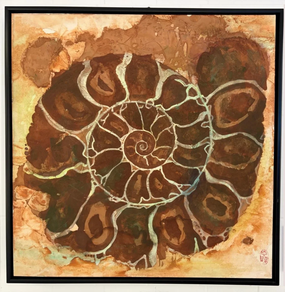 本港畫家袁景希的《回響》,凝視不同材質塑造的作品。鸚鵡螺剖面的內視截圖,咖啡色襯托鏽跡斑駁的質感,沉澱厚重的遠古生物寫照。深褐色裏透出淡綠色的微光,顯示出生生不息的生機。