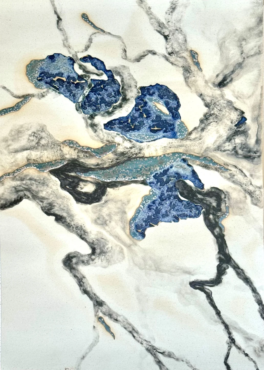 我們再欣賞另一位本港藝術家羅嘉豪的瓷板畫《願消退之前,結為晶石》。標題發人深思,感性的詩情畫意,咫尺之中帶有哲學的向度。尺幅不大的瓷板創作,視覺效果虛實相應,投入了羅嘉豪的深情。名題暗喻,世上任何事物都會流逝,包括生命、美好的相遇,希能在事物消逝之前,捕捉過程中最美的一刻,把此凝結成為堅實、永恆純澈的晶石。亦可理解為:藝術在實踐過程中,決不猶豫、果斷的創作魄力。