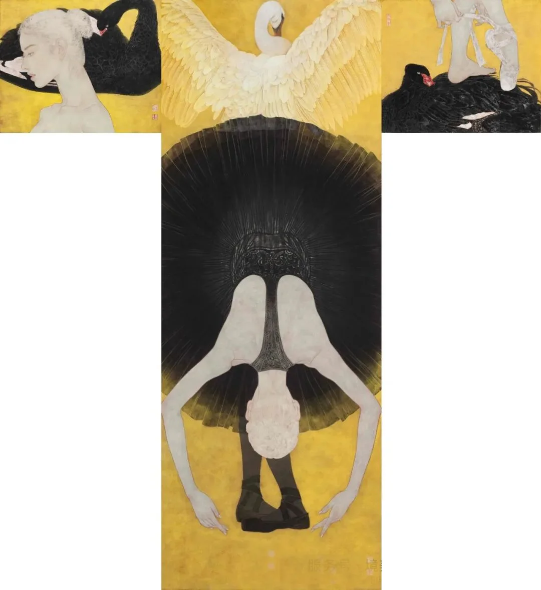 孫震生工筆重彩突破性的當代詩篇,以漢服裁剪出主輔的拼接方式,中間的豎幅將觀眾帶入天鵝湖的劇場。向舞台獻祭的舞者,俯身彎腰黑色的芭蕾舞裙,如孔雀開屏,銜接上面白天鵝的展翅雙翼,超現實的意象融為一體,使黑白兩元對立共存,天使與魔鬼;純潔與誘惑合二為一。左右兩則的拼幅,左面是舞者若有所思的侧面,黑天鵝依偎在旁。右面是舞者繫鞋帶的腳尖,踮着局部的黑天鵝身軀。補充了舞者的身份與掙扎,真邪兩者在控制、釋放中拉扯,揮之不去的纏繞。