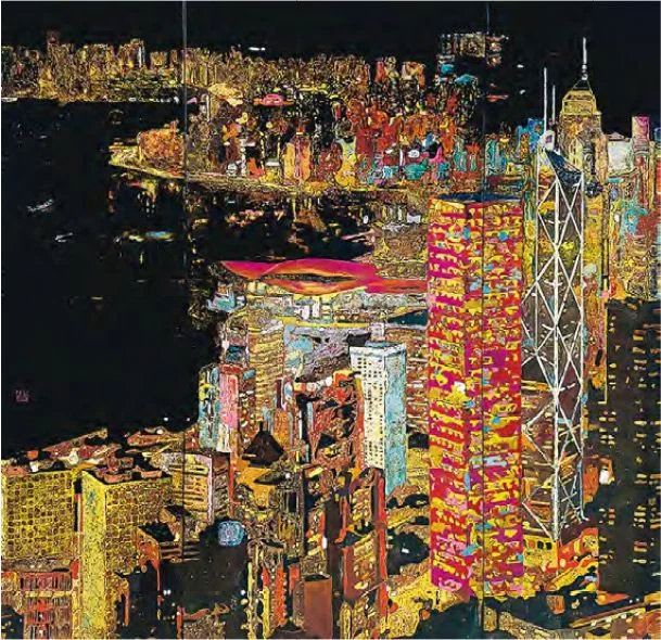 本港參展藝術家朱德源的《璀璨星光》,猶如交響曲奏出氣勢磅礡的音量,序幕開啟那璀璨的夜色華章,强烈的暖色調中繁星閃爍,黑色襯托紅橙黃藍的高樓大廈,濃艷高貴似錦繡般的夜景。維多利亞海港環擁的建築,像無數旌旗屹立深宵,於壯麗的旋律變奏中,豪邁奔放地迎向明天,誓將共同扛起肩擔,繼續不息地建樹豐碑。朱德源極為精準的構圖透視,廣角鏡頭下的視野,聚焦着國際都會的願景宏圖,極具張力的空間對話,是朱德源激勵人心的豪言壯語。